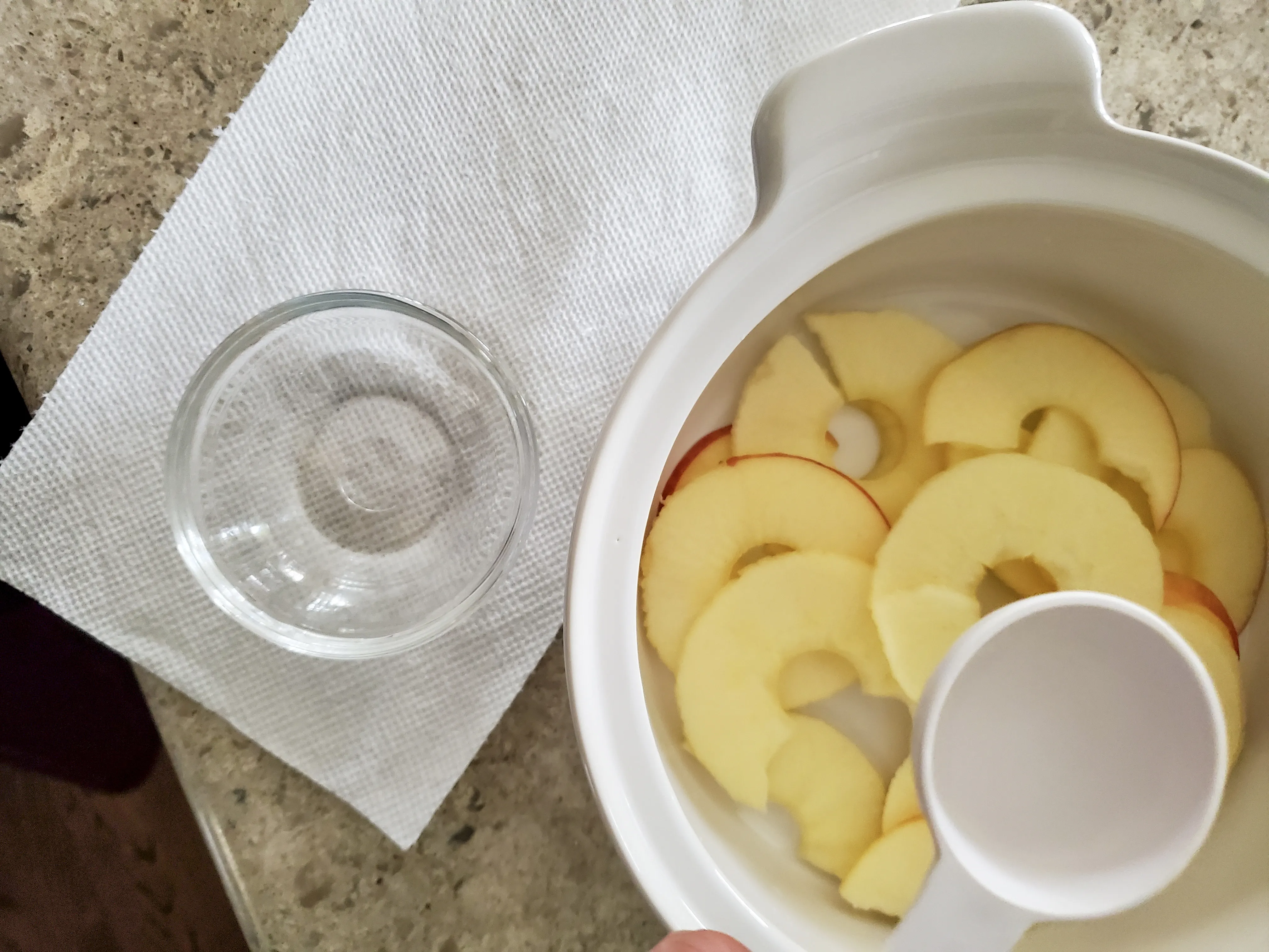 water being added to the sliced apples before it goes in the microwave