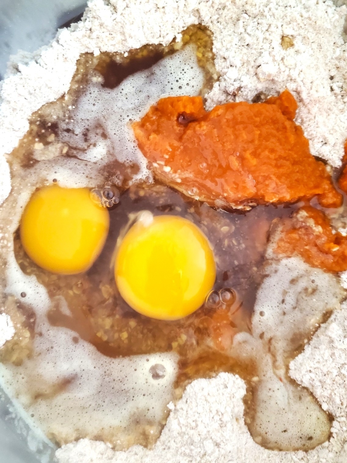 Add room temperature whole eggs, canned pumpkin puree, vanilla extract, and cooled brown butter to the flour mixture. Mix until combined. Be sure to scrape the sides of the bowl.