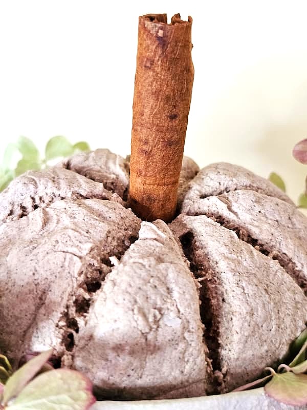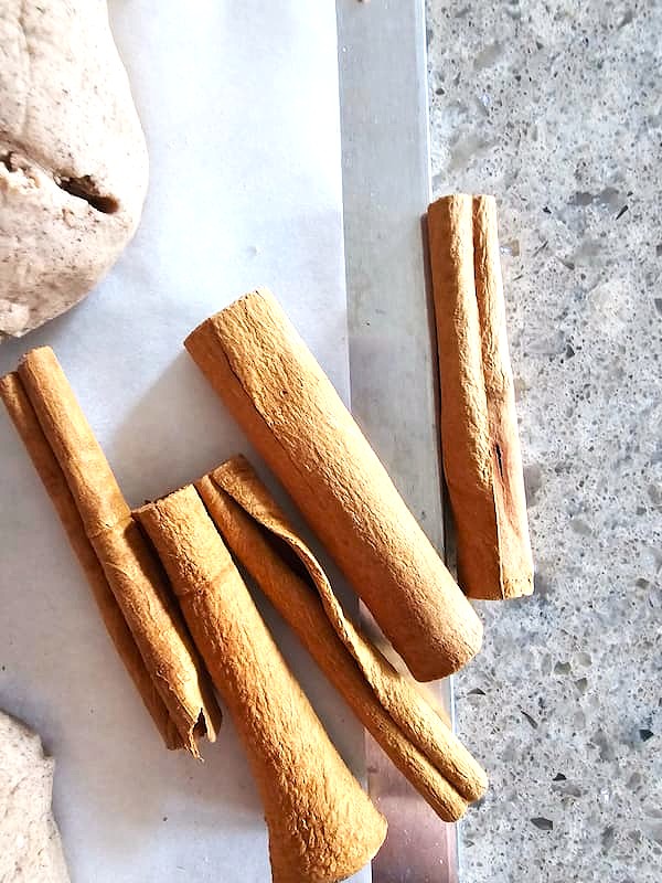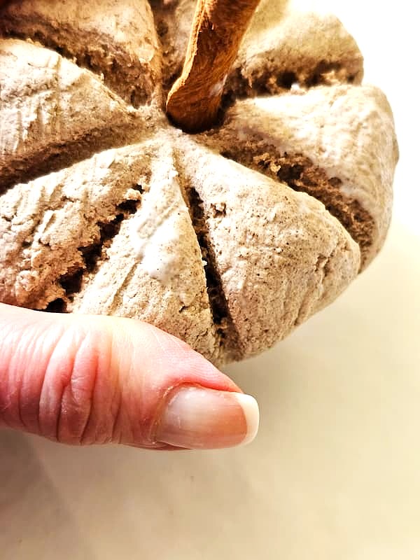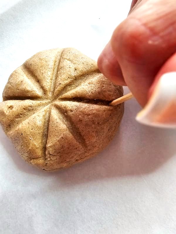 Roll the dough into small balls (the size of a large meatball) and shape them into pumpkins. To make the classic pumpkin creases, I used both a string and a toothpick. Pulling the string too tight flattens the pumpkin, so press gently. Use the side of a toothpick to deepen the lines all the way to the bottom. Finish with a cinnamon stick on the top of the pumpkin for a pumpkin stem. Important: See note below about adding small sticks for a pumpkin stem.